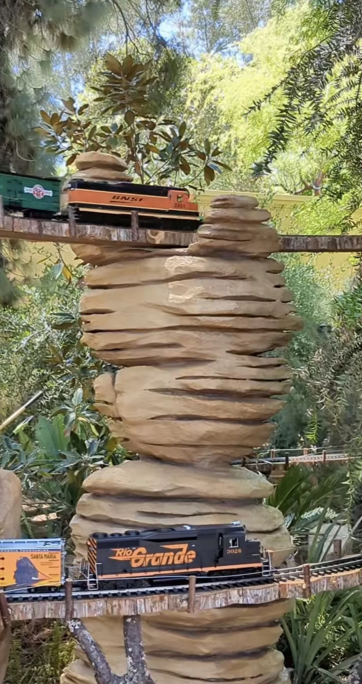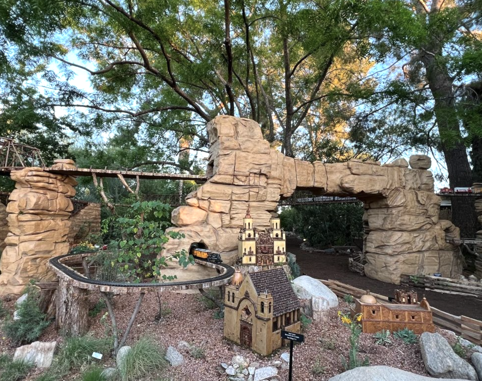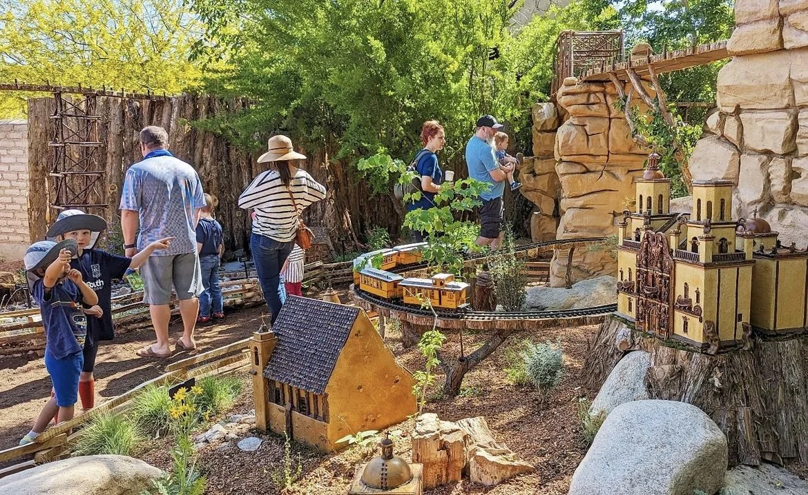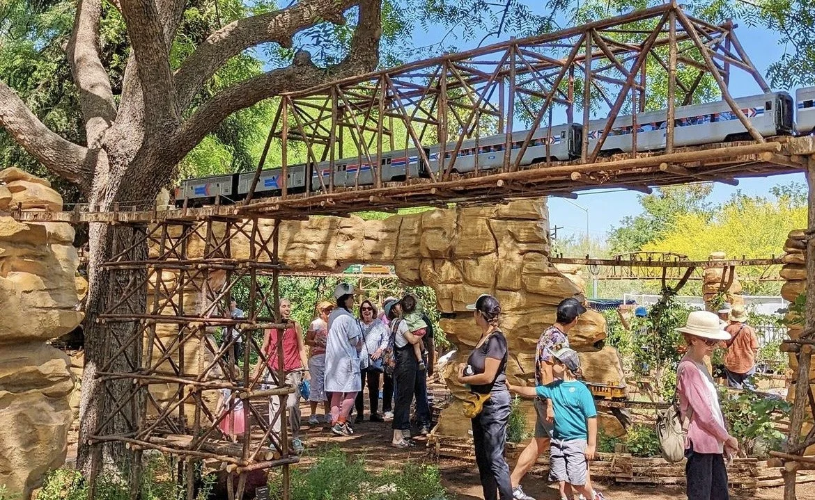 To create a walk-through garden exhibit with elevated train tracks inspired by iconic Arizona landmarks.