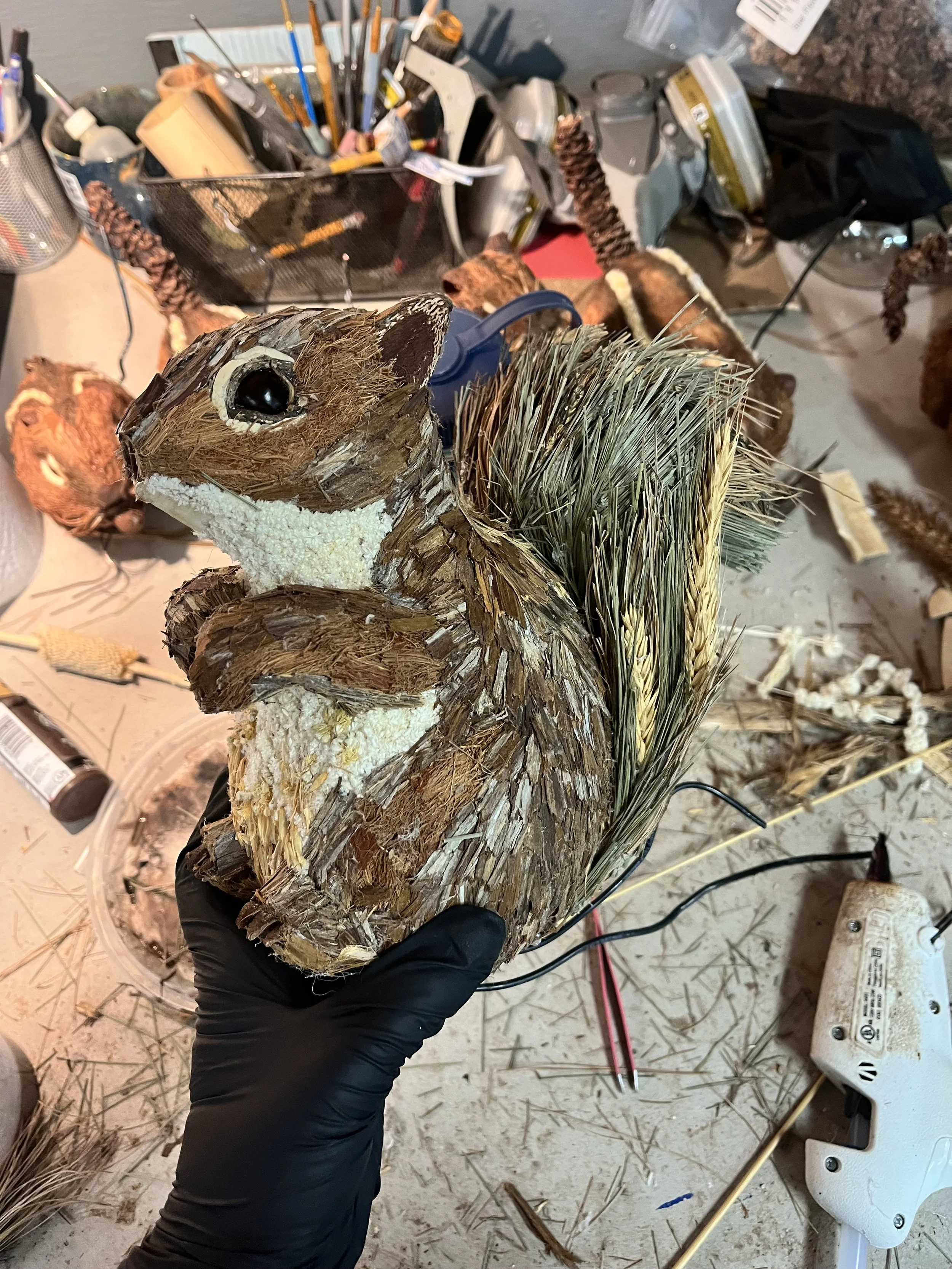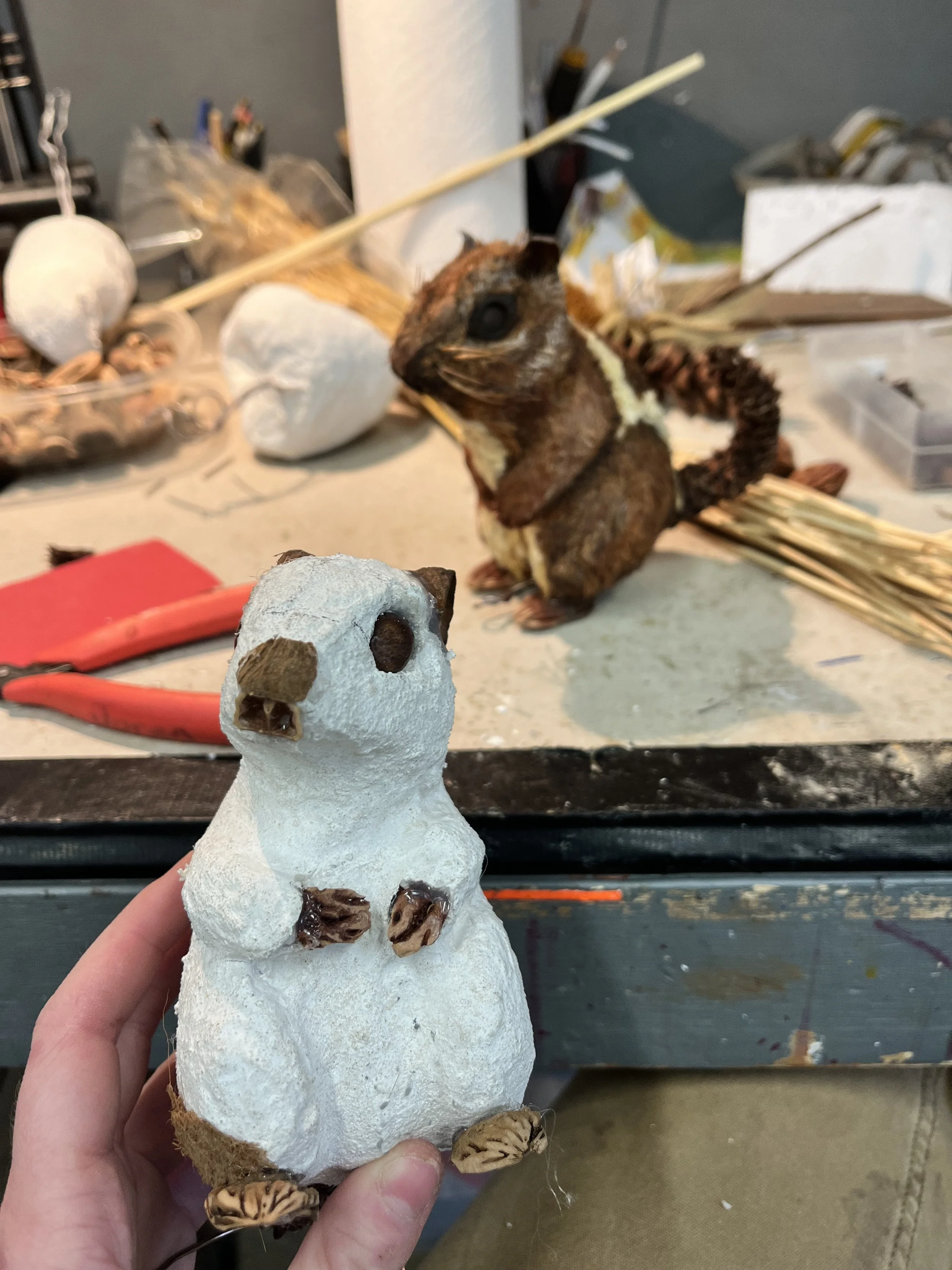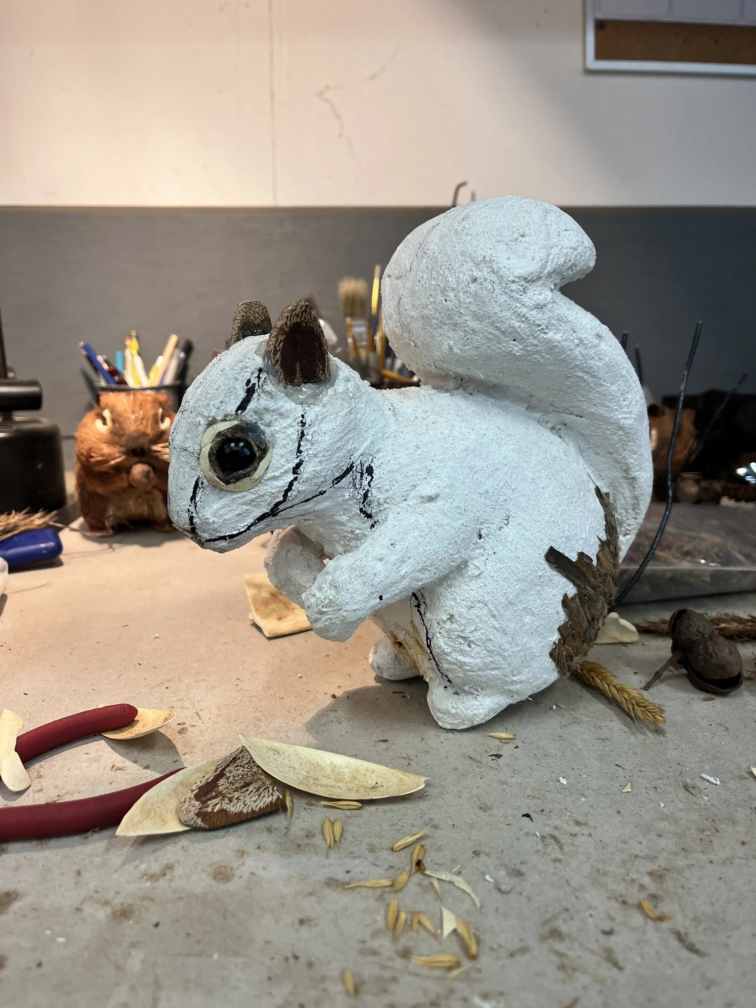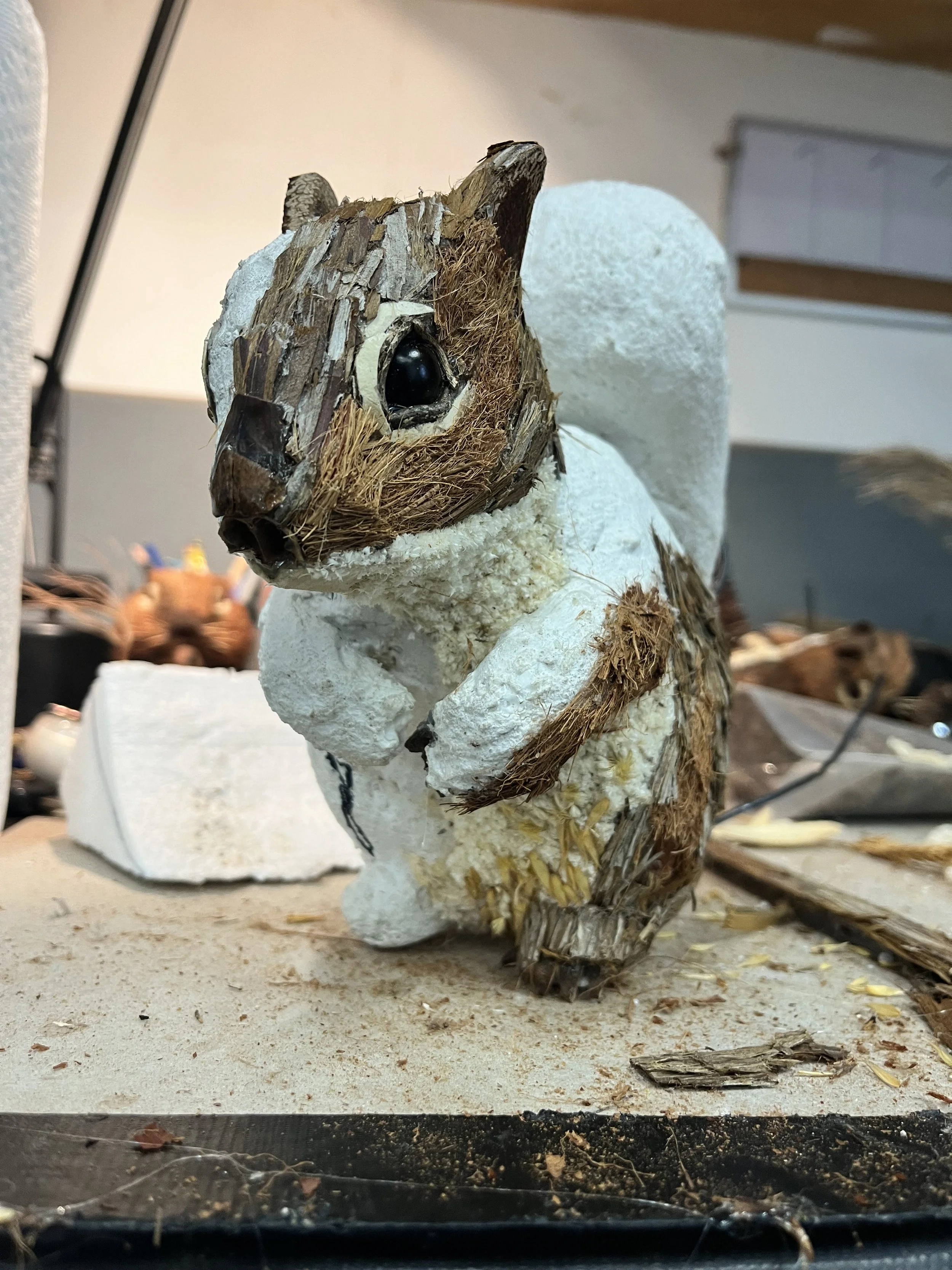 Carving squirrels out of foam and placing natural materials such as bark and palm fiber to make them look realistic.