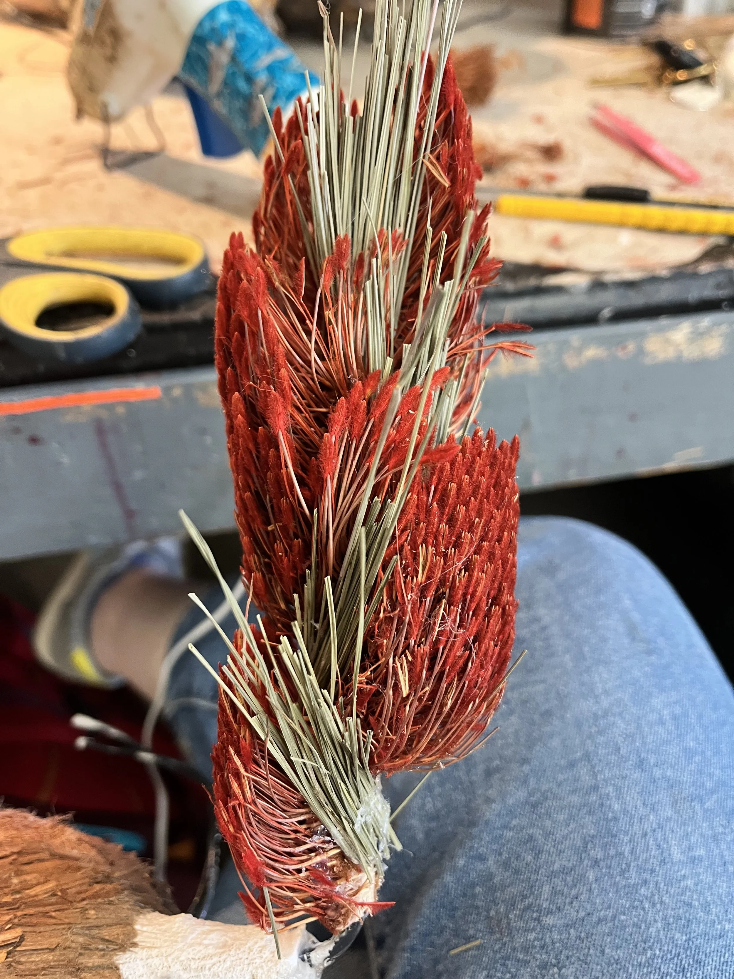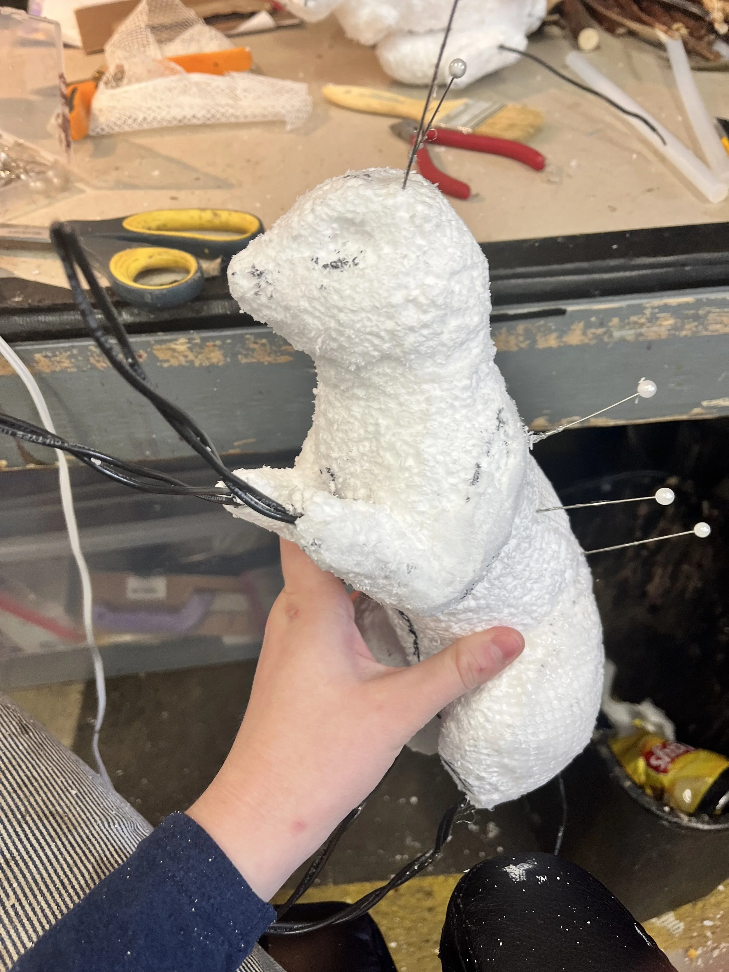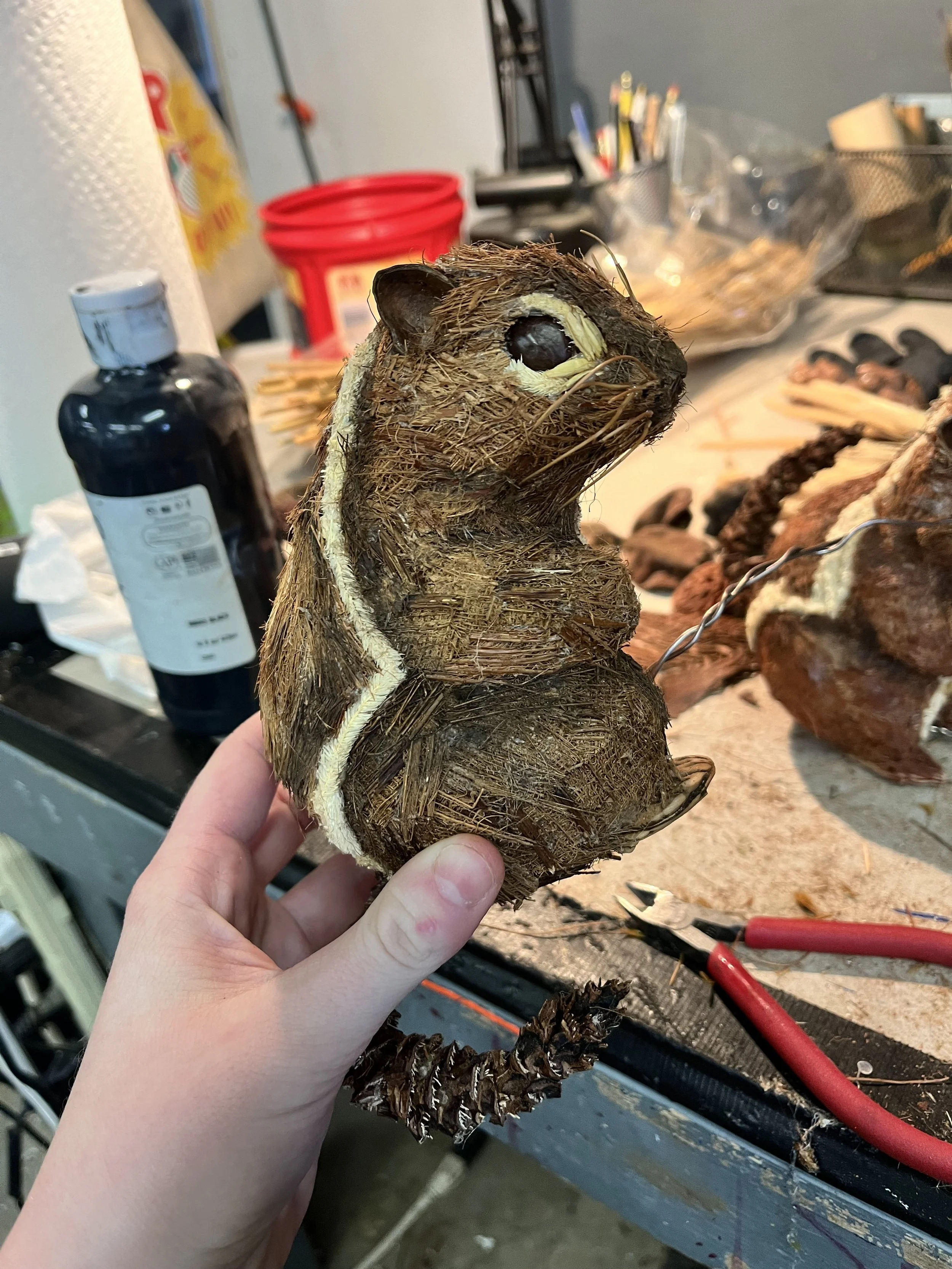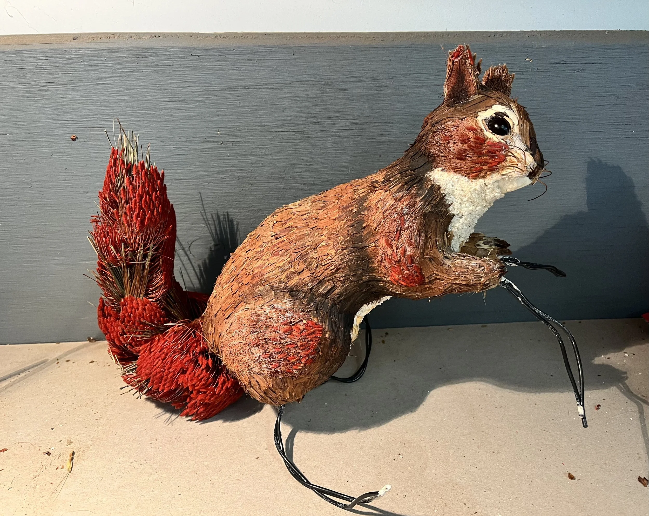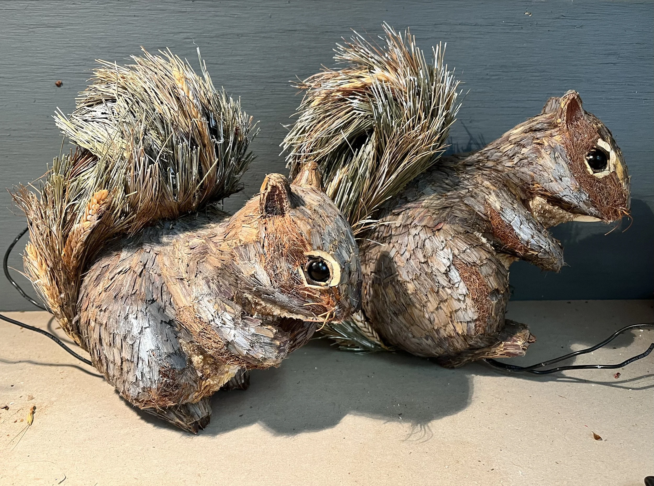 Carving squirrels out of foam and placing natural materials such as bark and palm fiber to make them look realistic.
