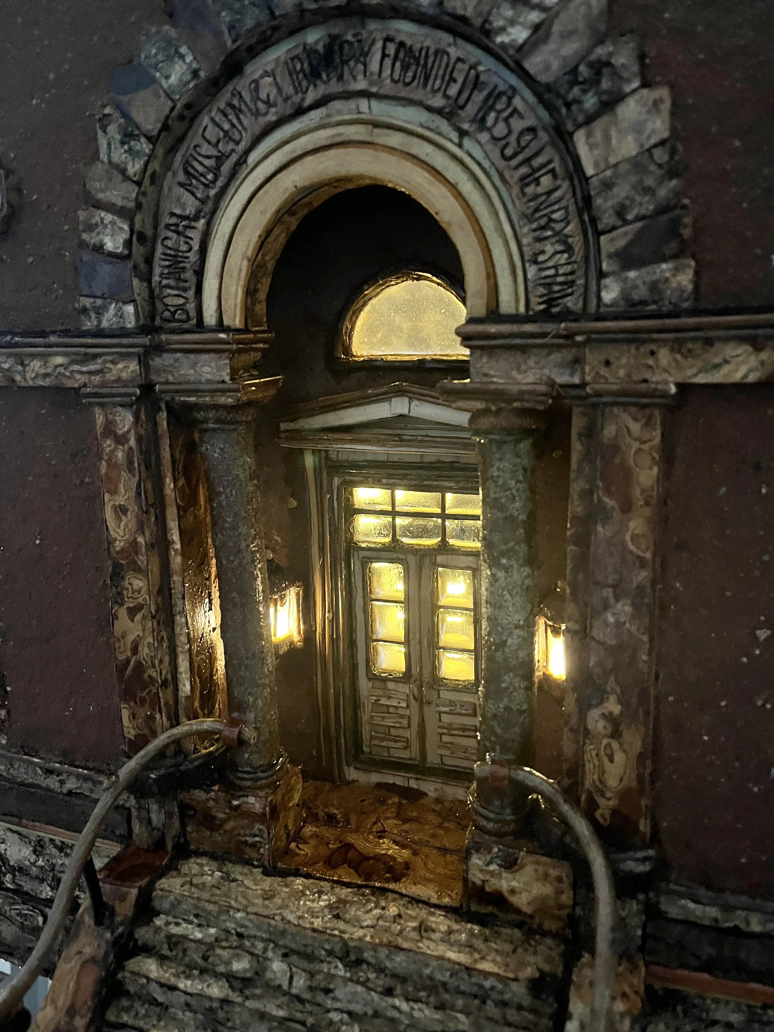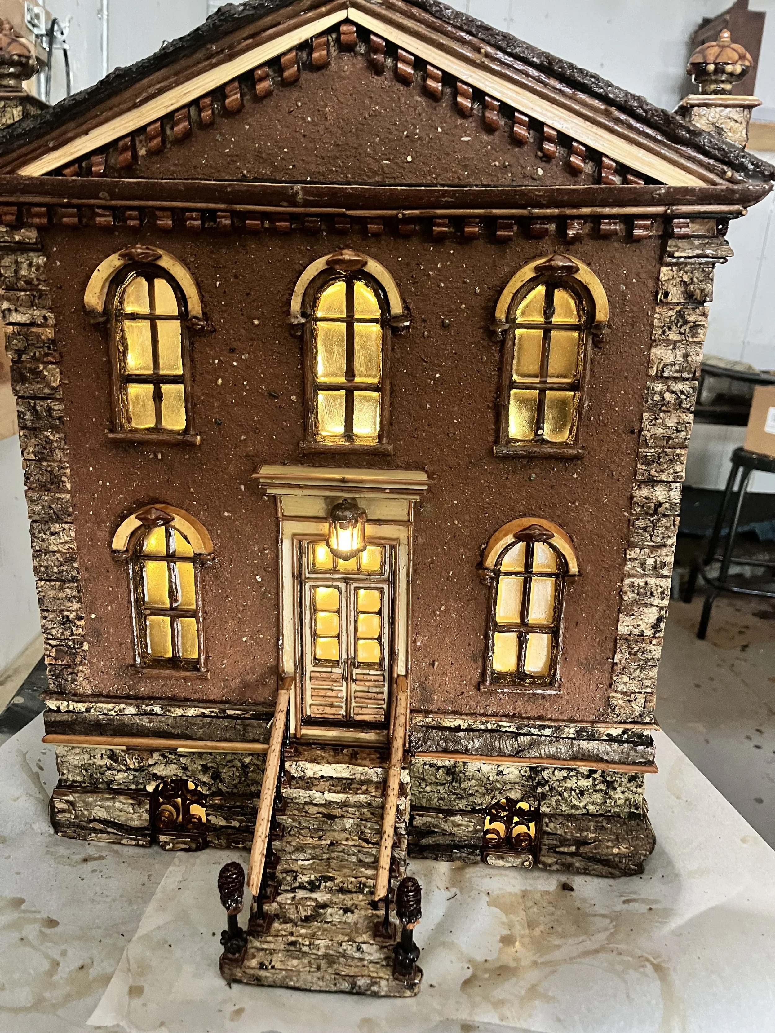 The materializing process also entailed carving the letters for the entry and making mini working porch lights.