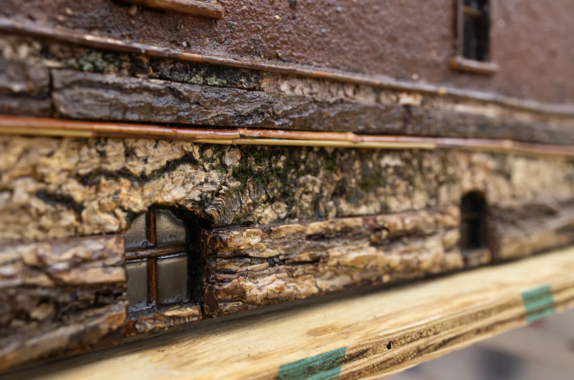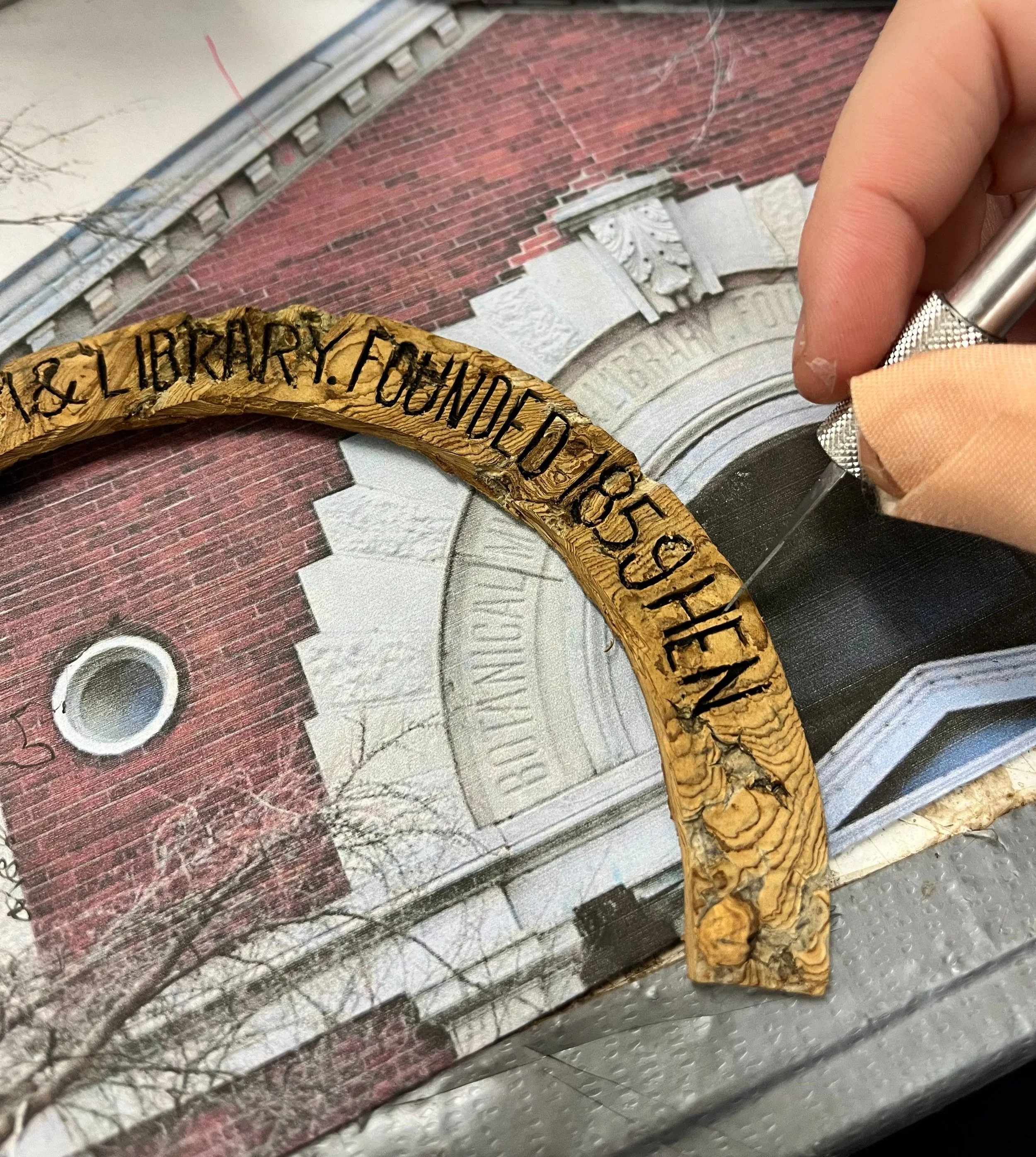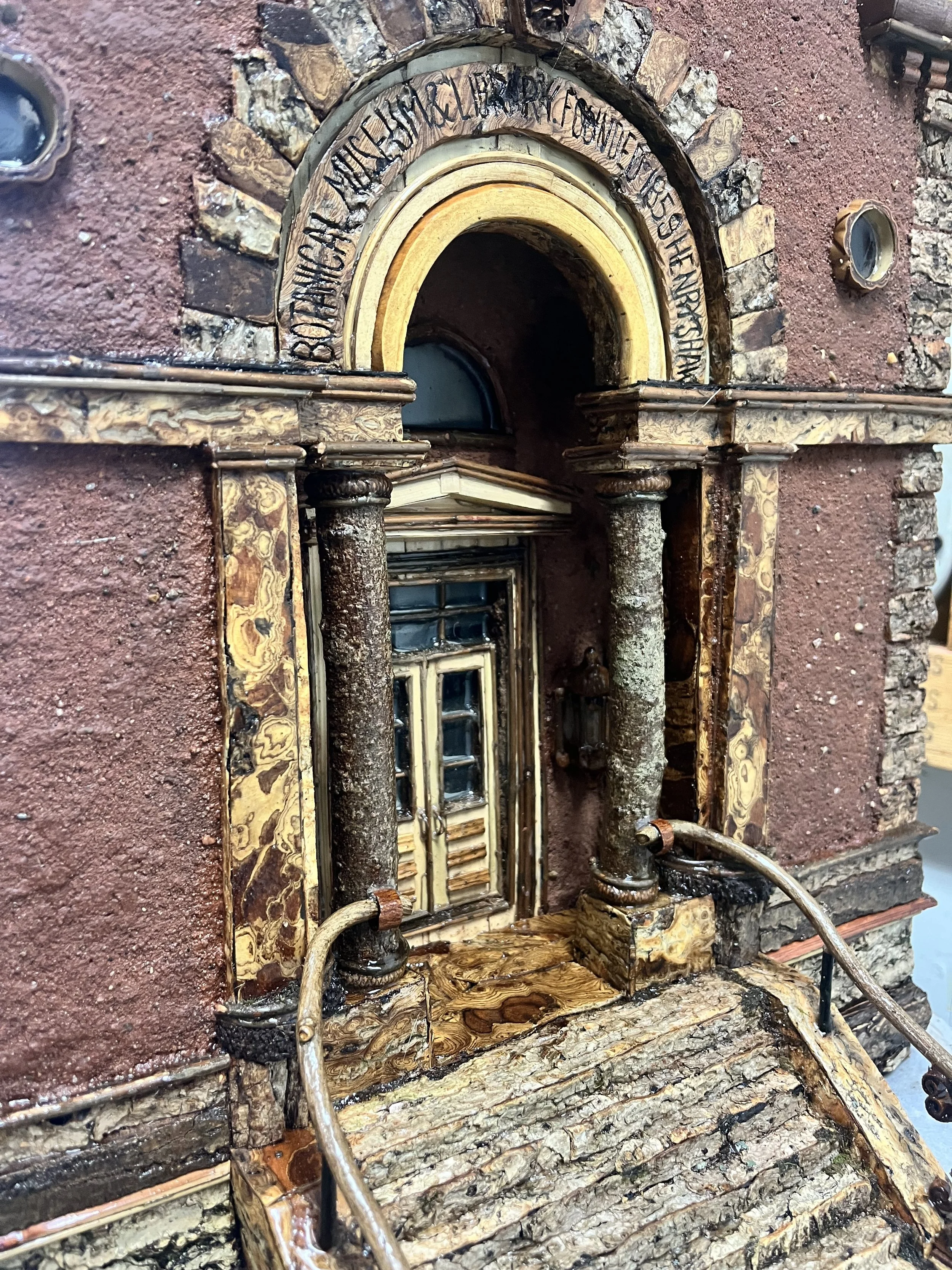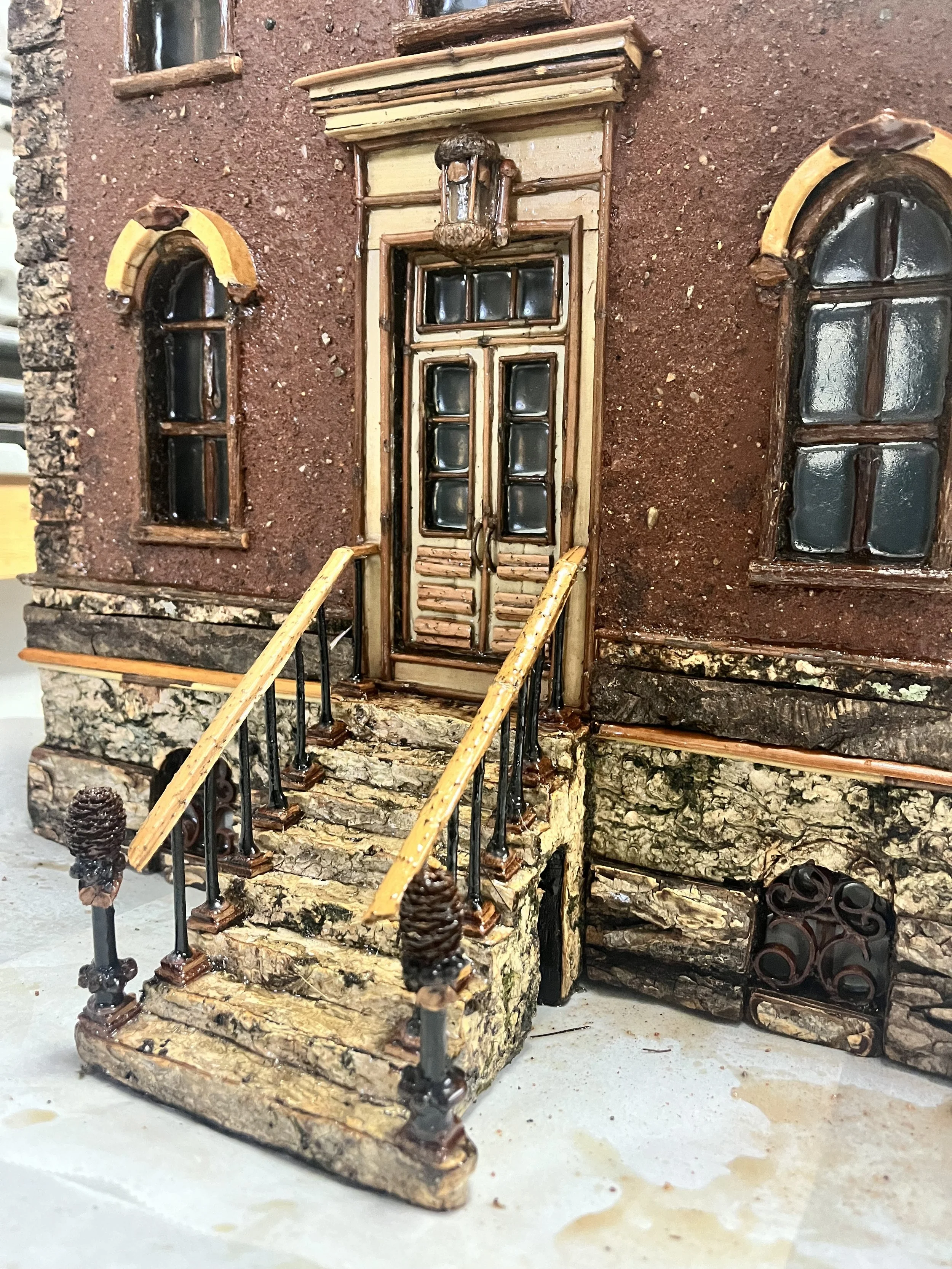 Adding various materials to make the model resemble the real building. Horse chestnut bark was used and sanded to mimic the off-white colonial style stone on the building.
