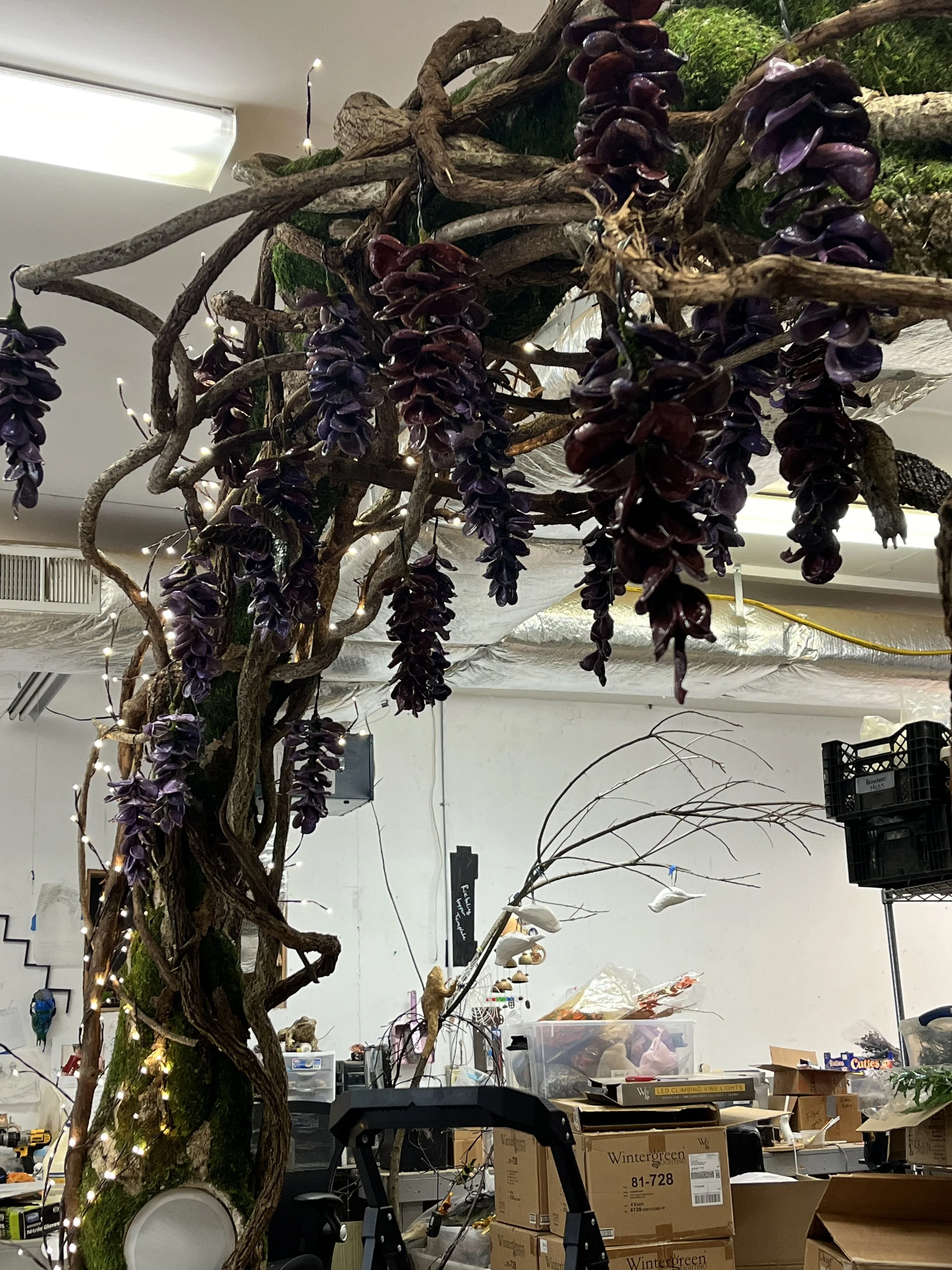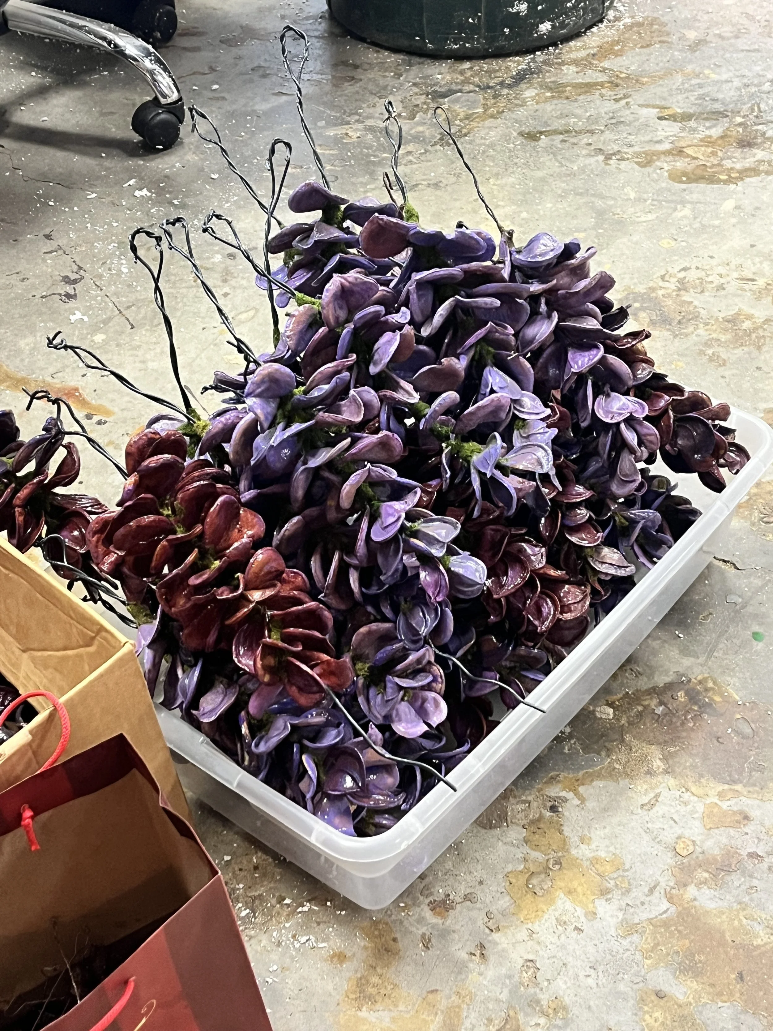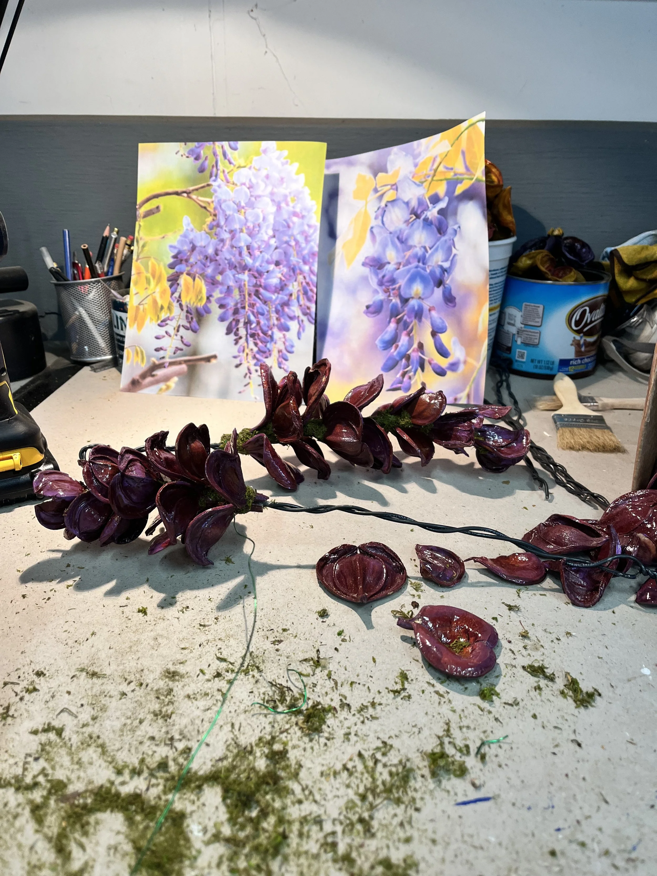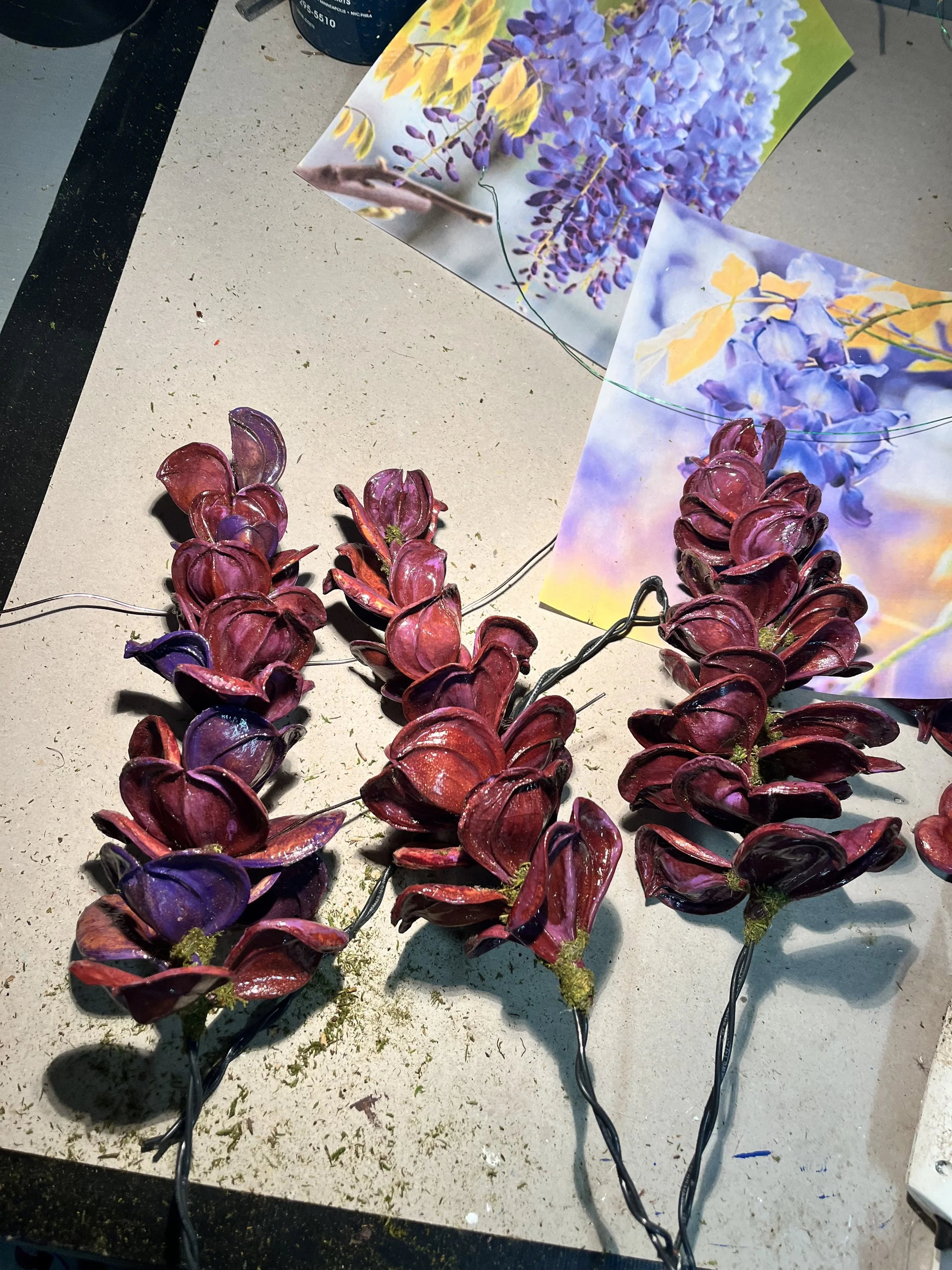 Painting and coating Pintado Heart seed pods, drilling holes, and intertwinning them with wire to represent wisteria.
