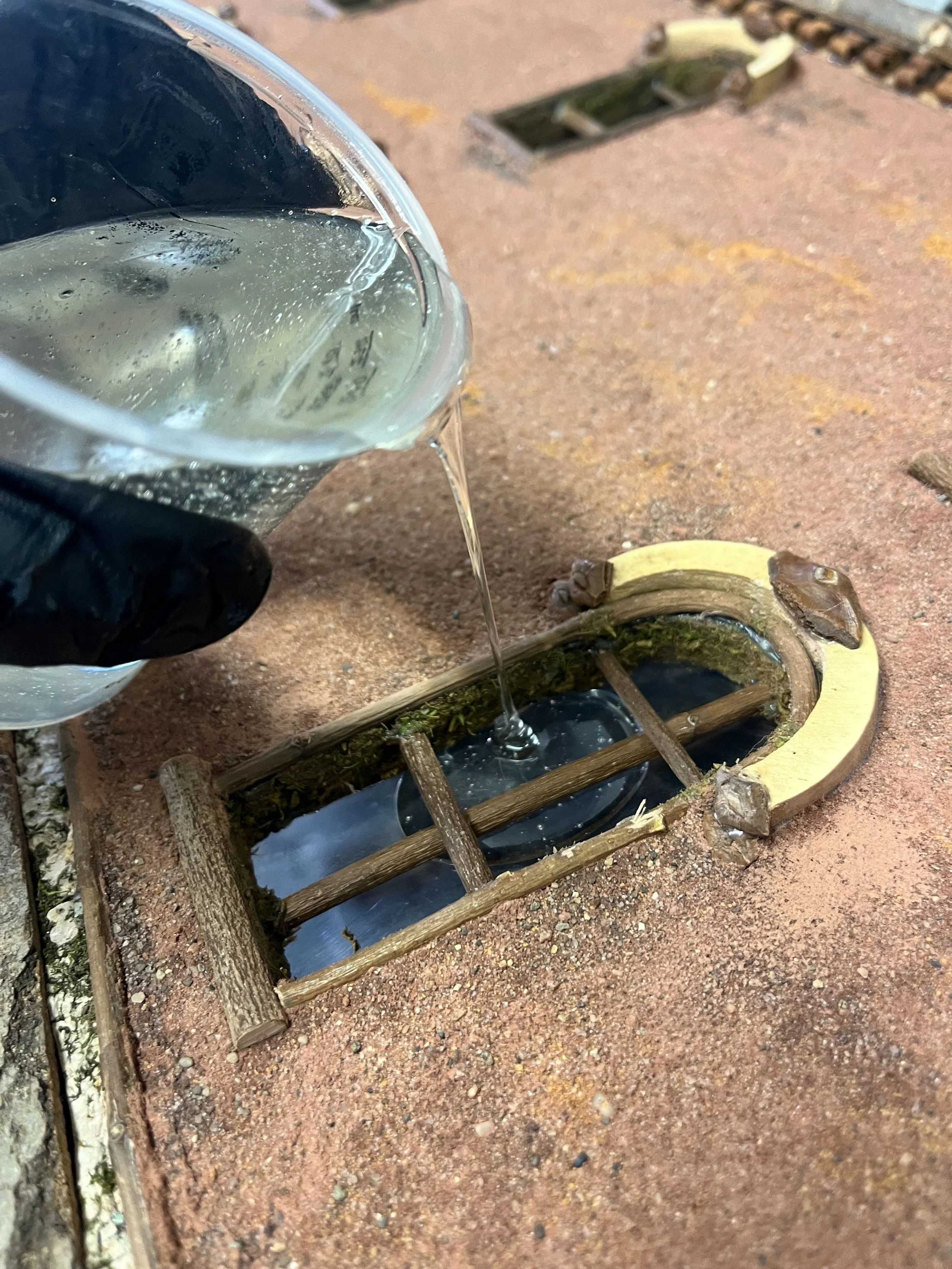 Applying horse chestnut bark, peat moss, and ground cork to hide exposed supports for train track.