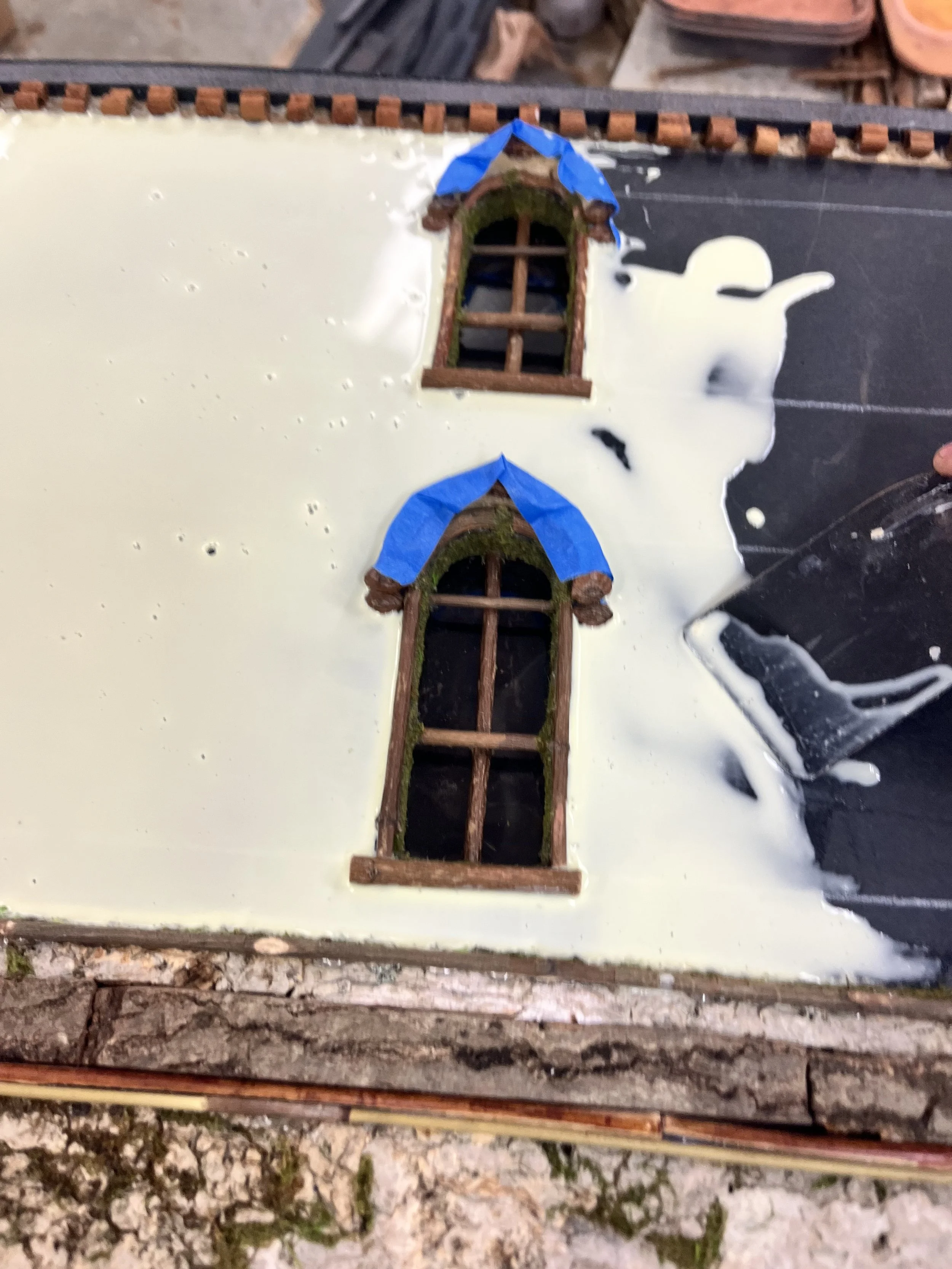 Grout pouring for the walls, UV resin pouring for the windows, and cutting locust wood for the roof shingles.