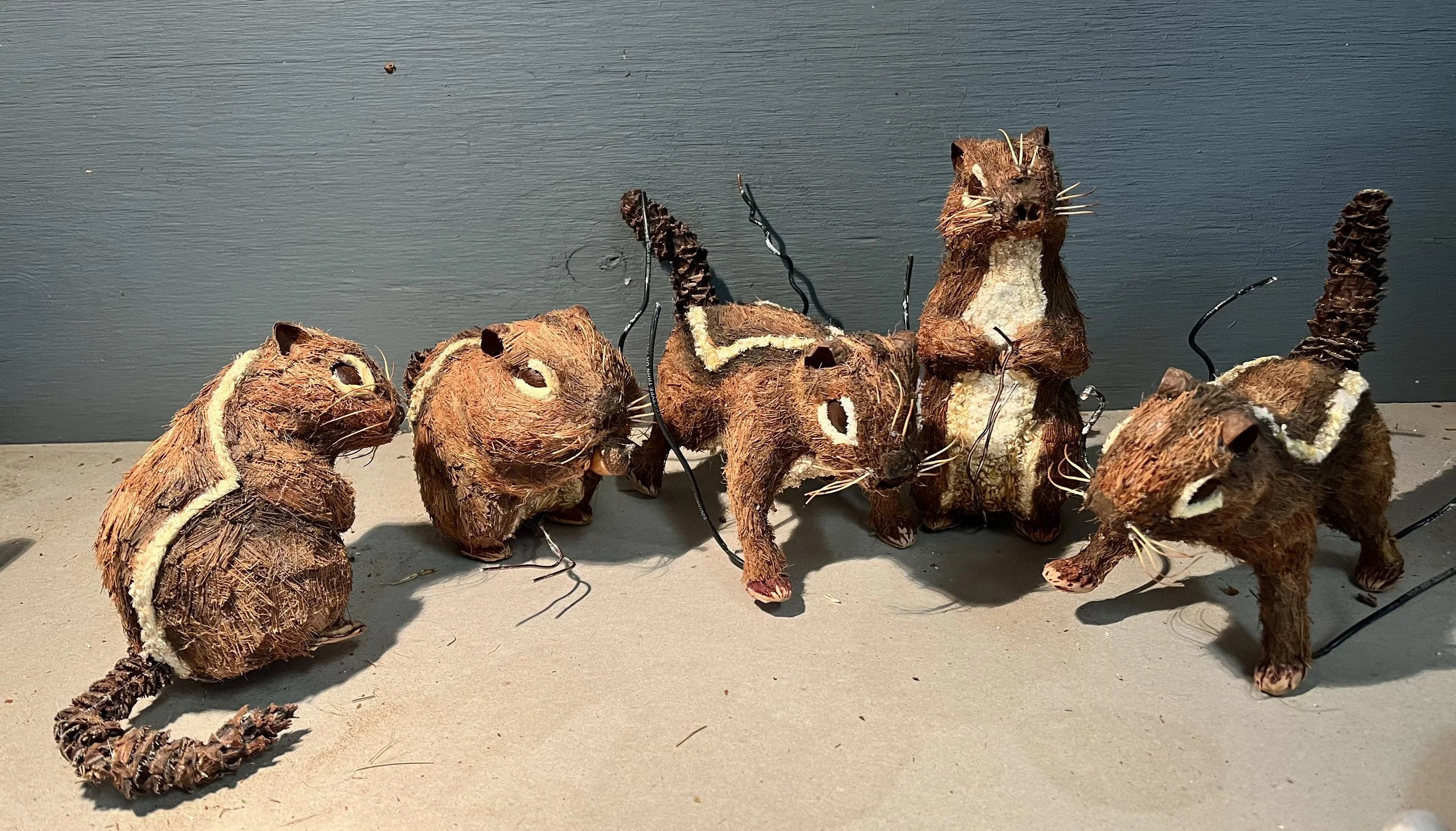 Carving chipmumks out of foam and placing natural materials such as peach pits and palm fiber to make them look realistic.