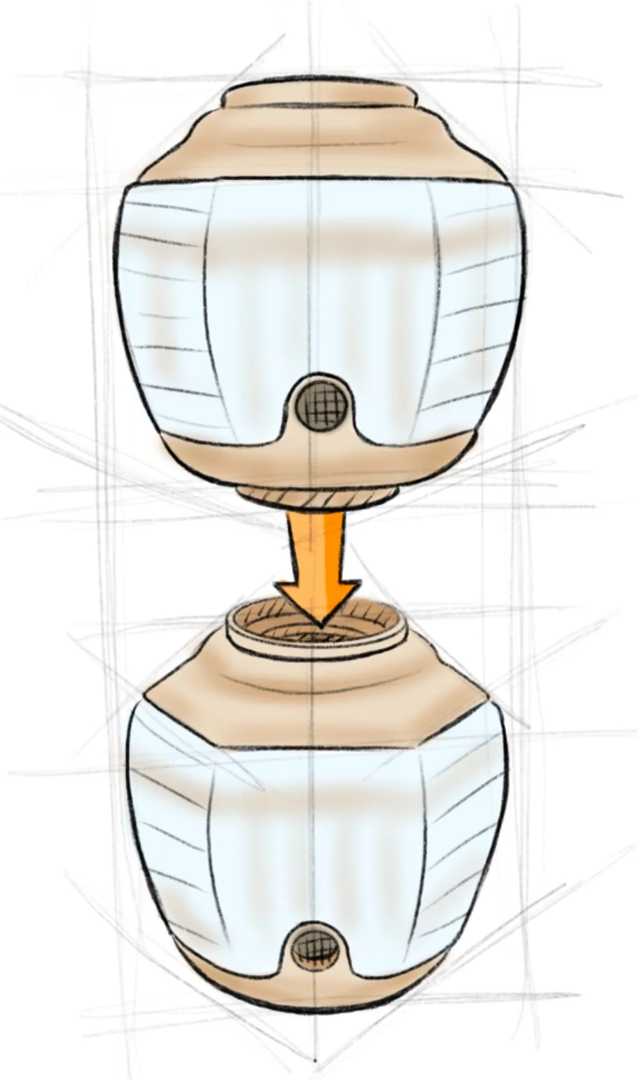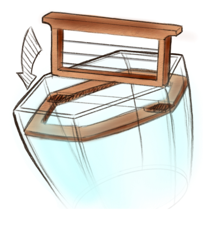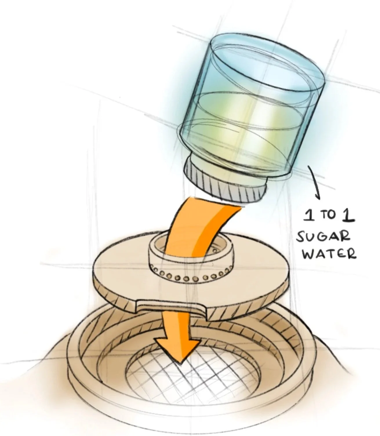 Acquire the top feeder attachment. Fill the jar with a ratio of 1:1 sugar and water and allow to dissolve. Screw back onto the attachment and add to the top of the brood box.