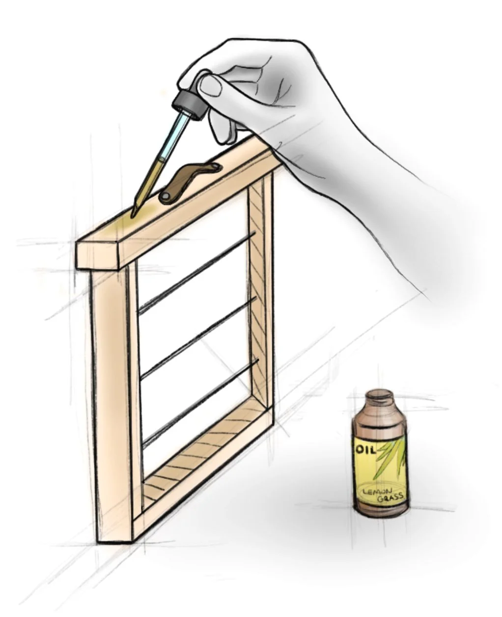 Treat frames with lemon grass oil by putting a few drops onto the top of the hive frames to attract the bees. Then put them into place in the brood box.